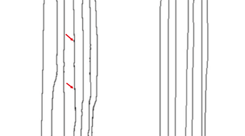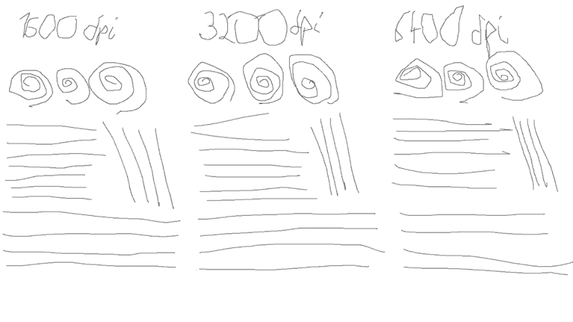 Auf der linken Seite erblicken wir allerdings ein anderes Verhalten. Es hat den Eindruck, dass der Sensor der Maus sich neu ausrichtet und positioniert und damit eine neue Linienführung beginnt, die an eben jenen Punkten aus dem Bild mit einem „fetten“ Ansatz einhergeht.