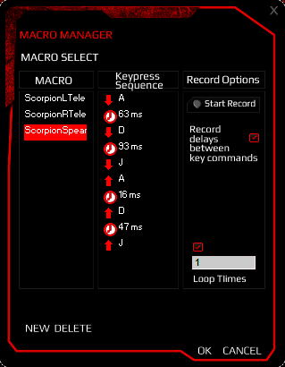 So oder so öffnet sich dann ein kleineres Fenster, in welchem sich nun Tastenkombos programmieren lassen. Zuerst erstellt man ein Makro, gibt diesem einen Namen und kann dann eine Tastenkombination aufnehmen. Dabei kann der Nutzer wählen, ob er die Zeit zwischen den einzelnen Aktionen mit aufnehmen will oder die Kombo ohne Verzögerung abläuft. Auch kann der Nutzer einstellen, dass diese Kombo so oft wiederholt wird, wie er will. Allerdings kann man die Kombination nachträglich nicht mehr händig bearbeiten, sondern muss sie löschen und neu aufnehmen, falls einem etwas nicht passt. Das kann man so lösen, ein eleganterer Weg wäre jedoch erfreulich gewesen.