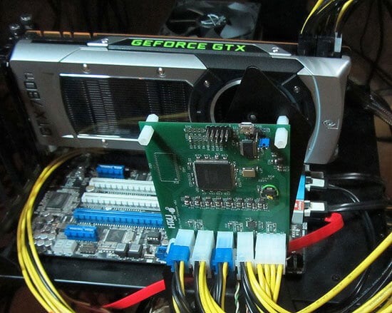 Bisher hatten wir hier auf einen eigens von unseren Ingenieuren umgebauten PCI-Express-Adapter gesetzt und dann mittels Zangenamperemetern den Stromfluss über die einzelnen Leitungsstränge zur Grafikkarte hin beobachtet. Wir sind seit weit über einem halben Jahr bereits einen Schritt weiter und agieren mit einem neuen Spielzeug, welches uns nun nicht nur minimale und maximale Leistungsaufnahme einer Grafikkarte auswerten lässt, sondern ebenfalls den durchschnittlichen Verbrauch.
