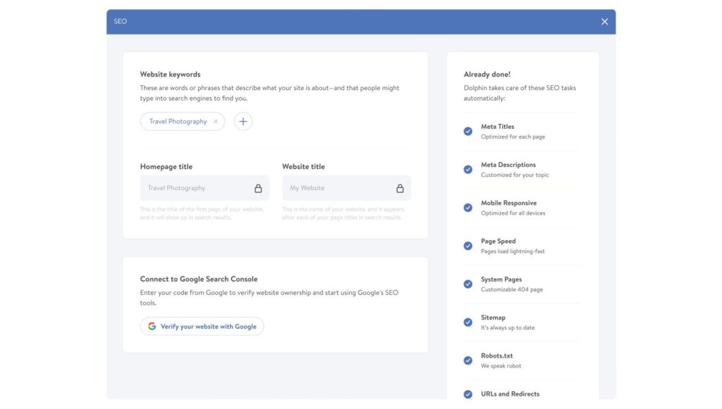 Leider sind die Möglichkeiten der SEO-Optimierung ebenfalls relativ begrenzt. Du hast lediglich ein Formular für deine Webseiten-Beschreibung, Keywords und Titel zur Verfügung. Das ist ein minimales Angebot an Möglichkeiten. Einen SEO-Assistenten wie zum Beispiel Wix es anbietet, vermissen wir ebenfalls.