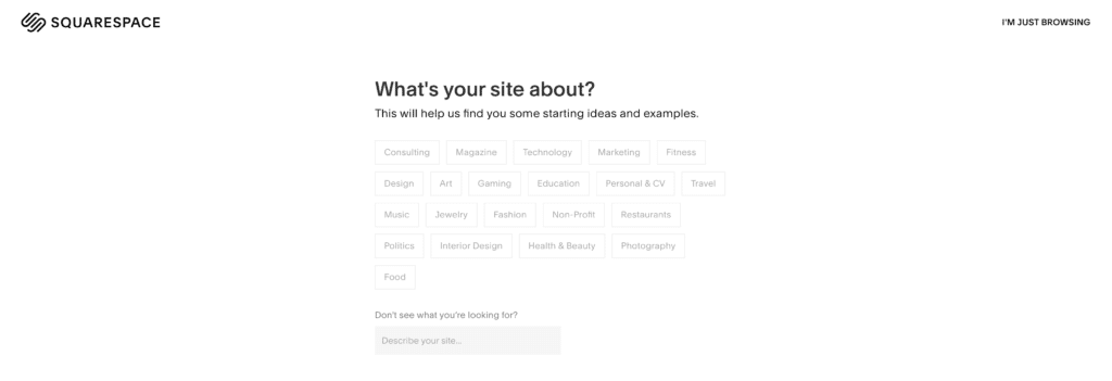 Bist du mit der Vorlage für deine Webseite zufrieden, kannst du eine Kategorie auswählen, die am besten zu deiner Webseite passt. Die Auswahlmöglichkeiten sind vielfältig und umfassen z. B. Medien, Musik, Reisen, etc. Anschließend wählst du das Ziel deiner Webseite aus. Möchtest du eine neue Veranstaltung ankündigen, Bilder und Videos auf deiner Webseite präsentieren, einen Blog führen oder Produkte auf deiner Webseite verkaufen. Bist du damit fertig hast du außerdem die Möglichkeit auszuwählen, ob du die Webseite für dich selbst, einen Freund oder Familie oder einen Kunden erstellst. Danach gibst du nur noch eine Seiten Beschreibung und den Titel für deine Seite an und du bist mit dem ersten Schritt bereits fertig und Squarespace entwirft eine Webseite nach deinen Angaben. Das Ganze ähnelt dem Webseiten Builder „Dolphin“ von Jimdo ein wenig, ist aber weniger umfangreich.